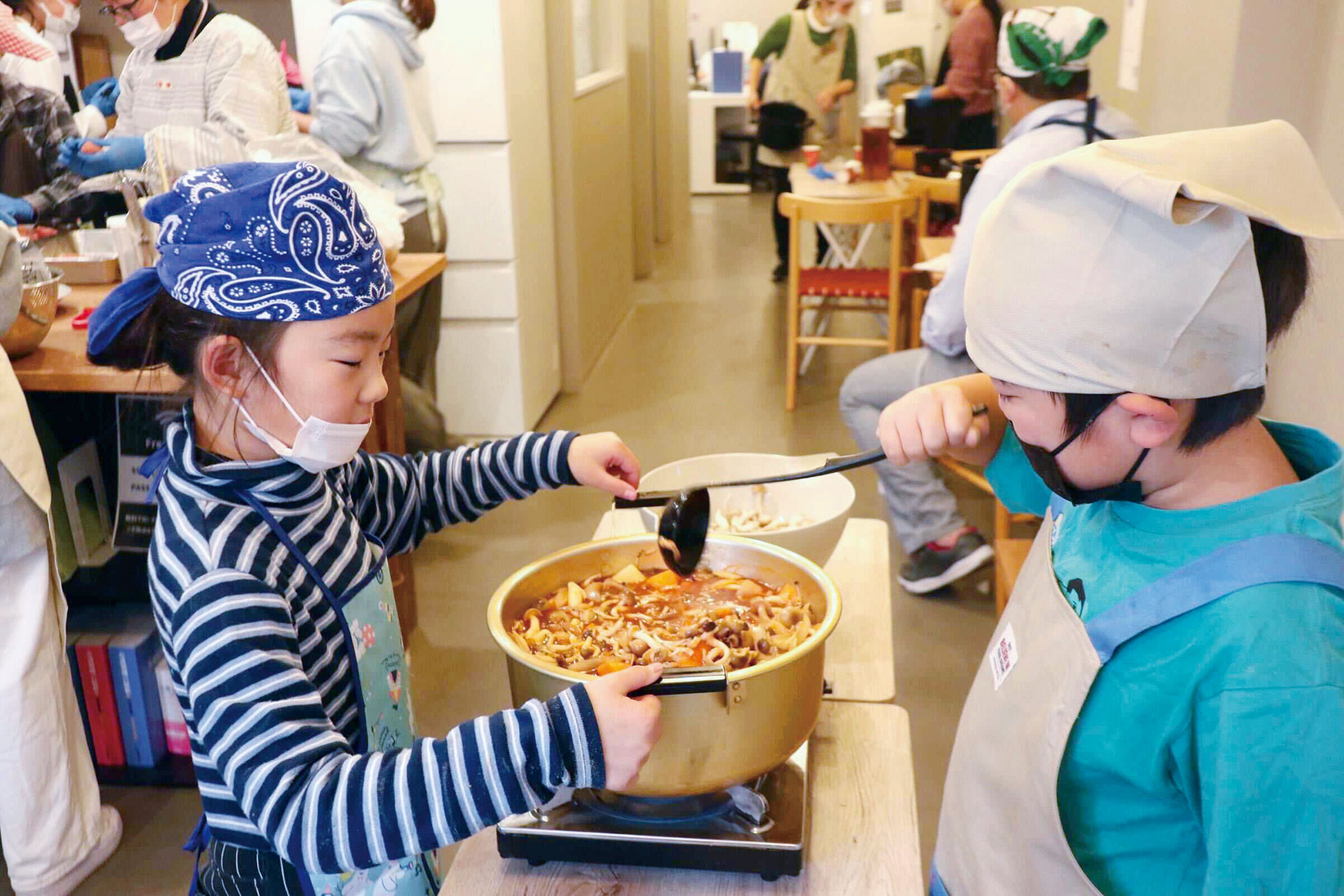 食堂のボランティア体験で、煮込みハンバーグをつくる子どもたち