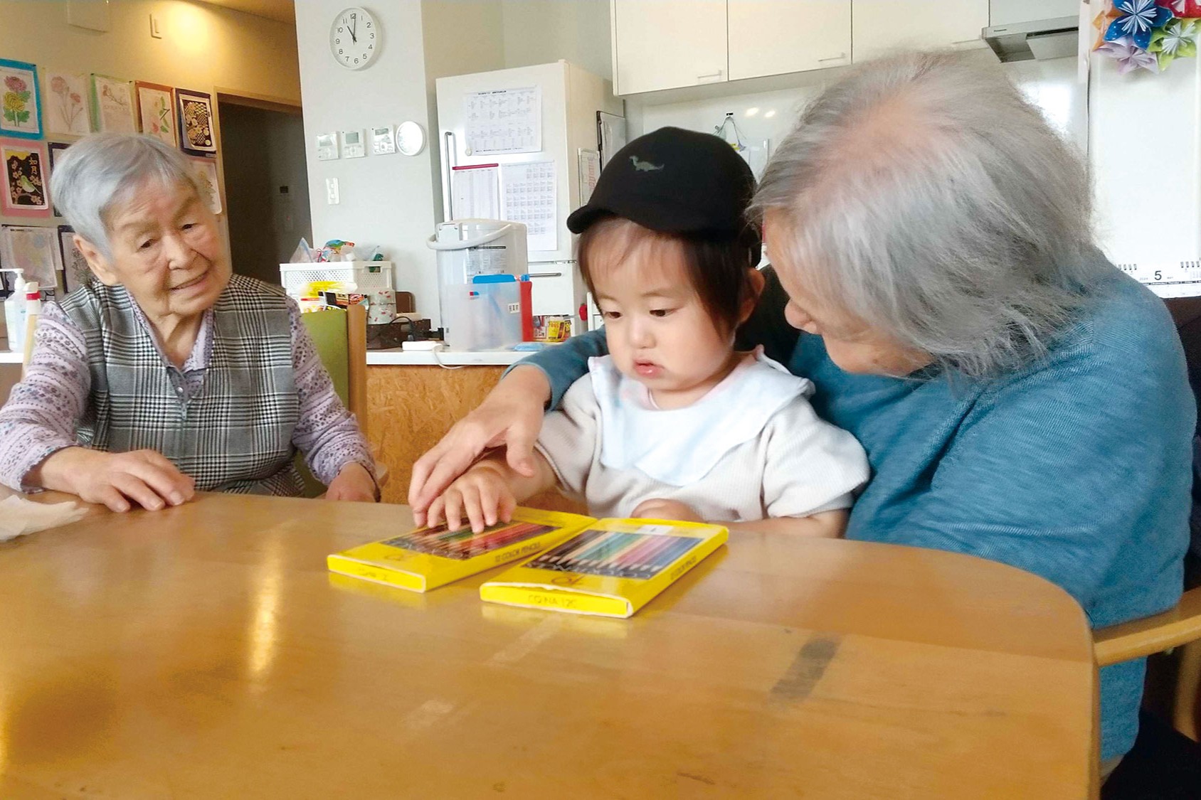 子どもが膝の上に乗るとデイサービスの利用者さんにも笑顔がこぼれる(杜の家なりた)