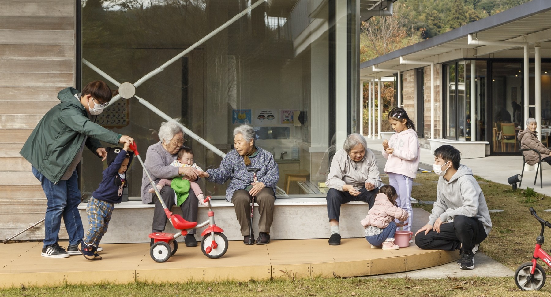 放課後等デイサービス(放デイ)には小学1年生から高校3年生までの障害のある子どもたちが通い、保育所には職員の子どものほか、地域の子どもが通っています。子どもたちは日中、同じ施設にある高齢者デイサービスや特別養護老人ホームに行って、おじいさんやおばあさんと遊んだり、放デイと保育所の子どもたち同士で走り回ったりしてはしゃいでいます。追いかけるのも大変です(笑)。高齢の利用者さんが子どもを膝の上で抱っこしているのを見ると、家庭でのワンシーンのようで、とてもほっこりします。